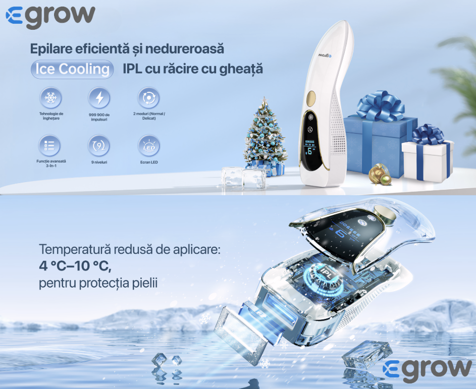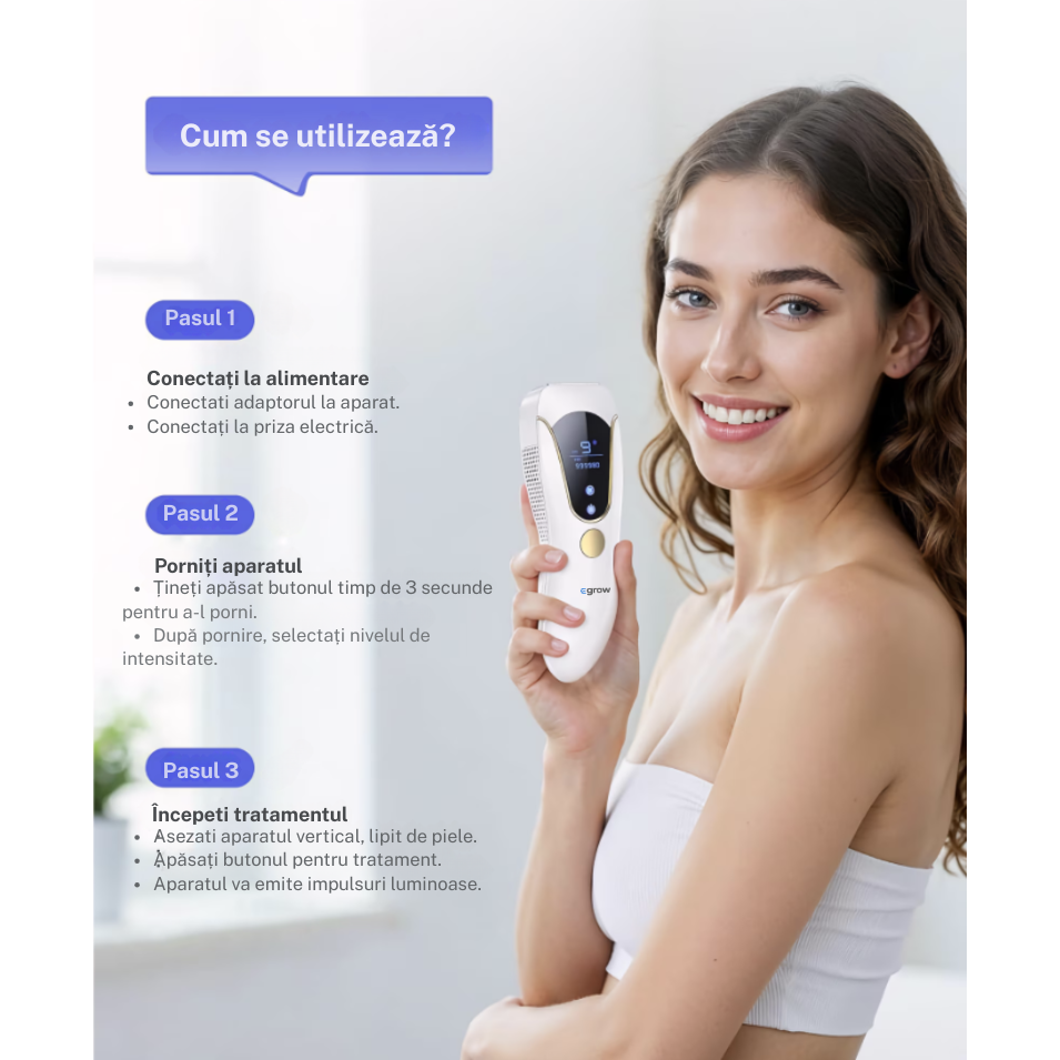 Epilator IPL eGROW® PRO SOFT SKIN, Pentru epilare definitiva fara durere, Tehnologie IPL, 9 Trepte de intensitate, 999.999 impulsuri, 3 Moduri de utilizare, Pentru femei si barbati, fata, corp, axila,