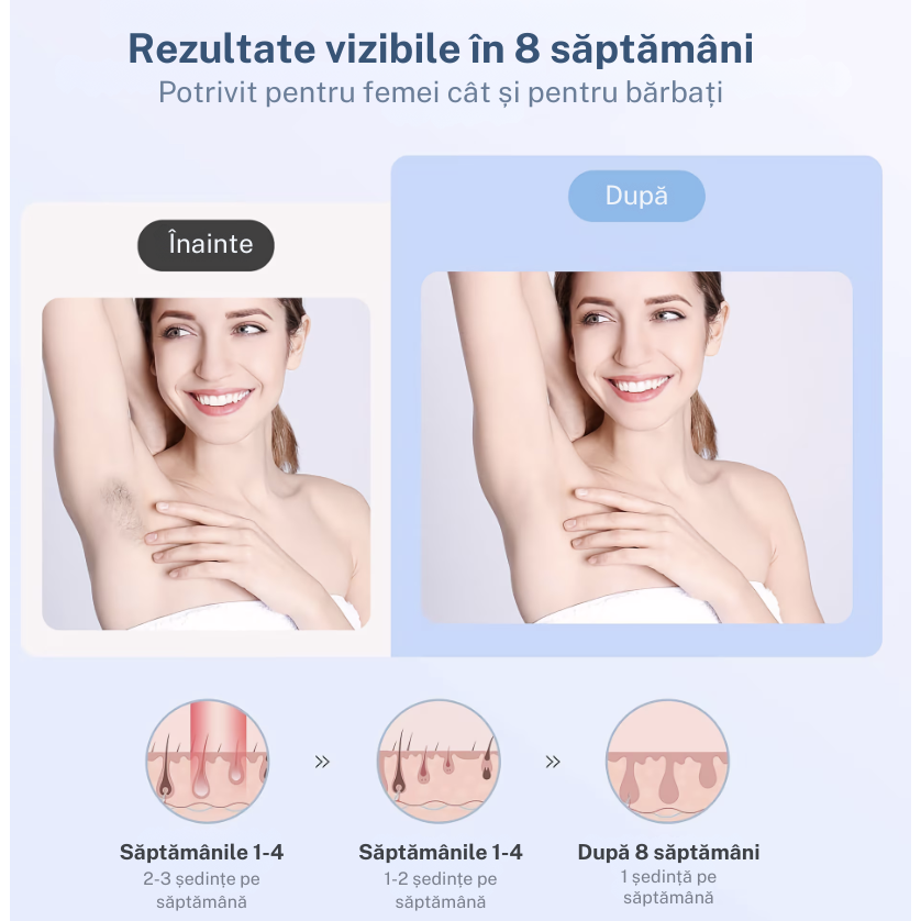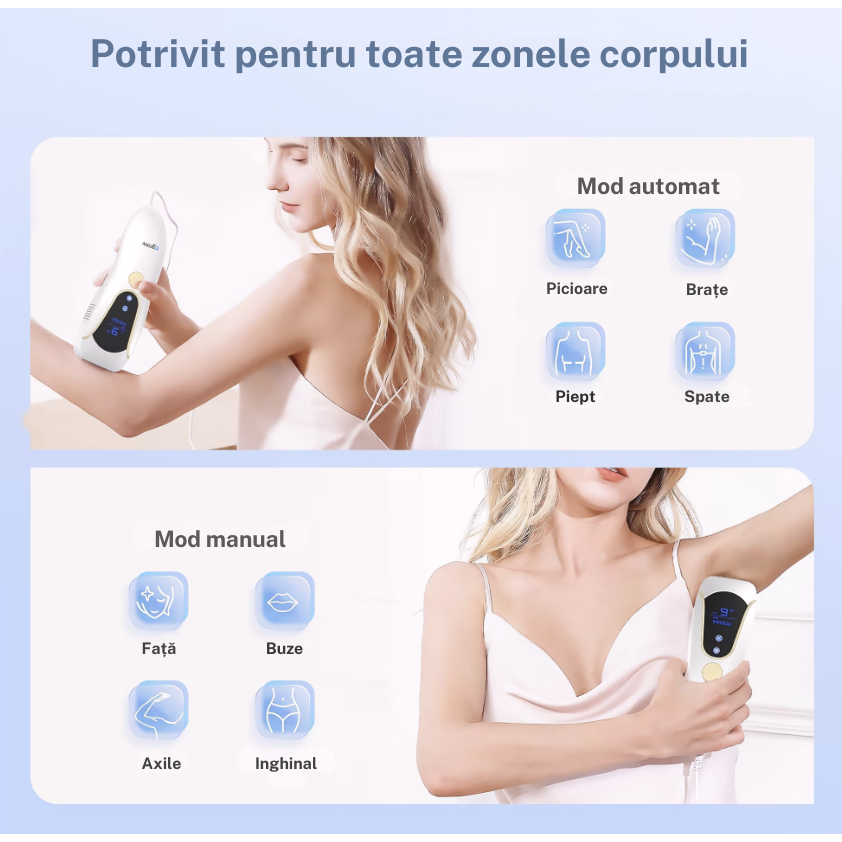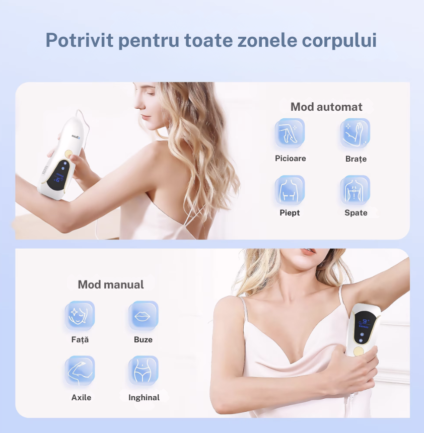 Dispozitivul dispune de un mod de racire cu gheata care reduce senzatia de caldura pe piele, oferindu-ti o experienta fara durere chiar si la intensitati ridicate. In plus, epilatorul include un set de ochelari de protectie pentru a-ti proteja ochii in timpul utilizarii