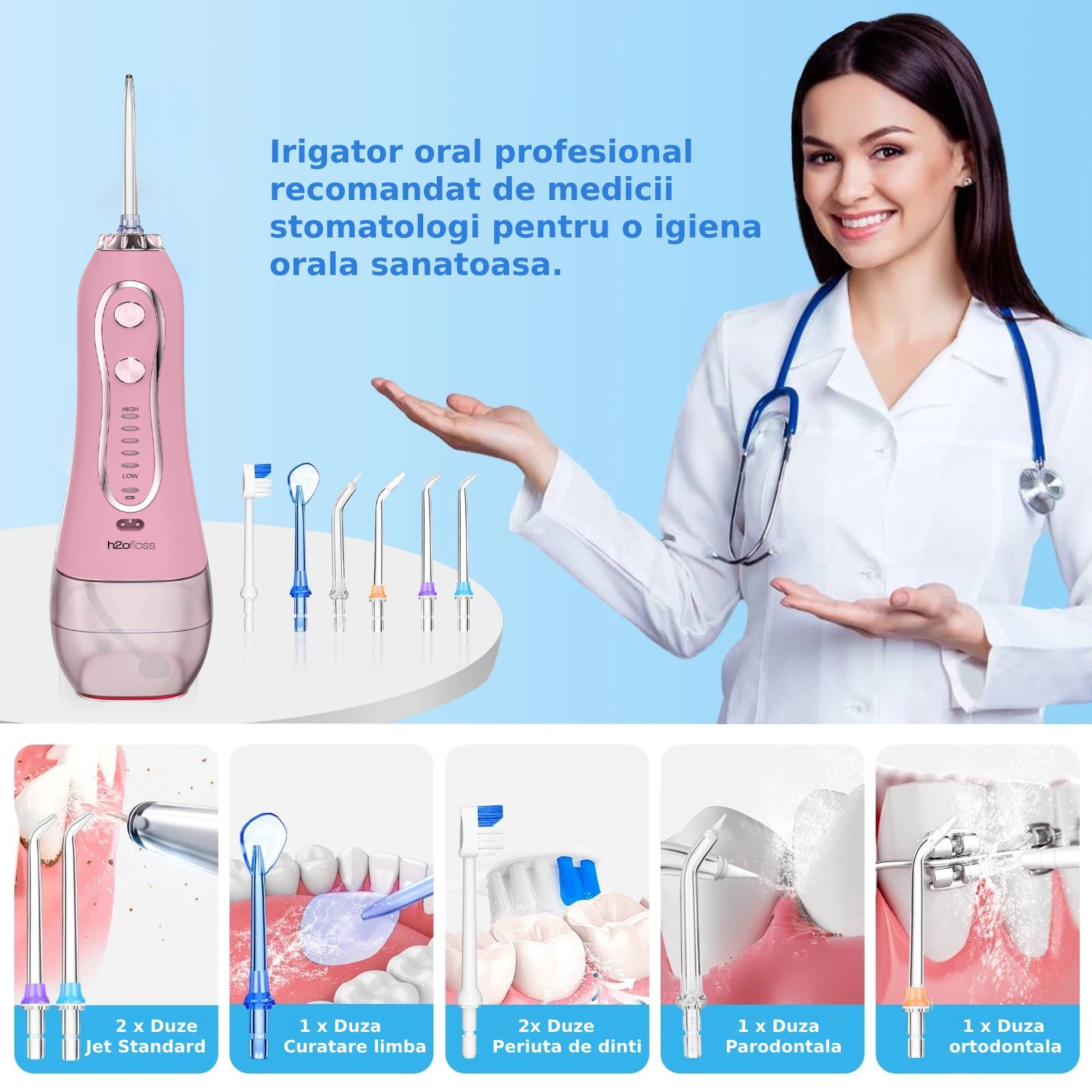 - Irigatorul oral vine insotit 8 capete de curatare,cablu de incarcare USB,trusa pentru transport si carcasa depozitare duze.
